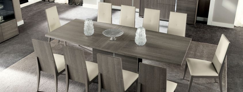 With curved sides and central extension leaf, the Tivoli table is featured in a hard wearing grey oak laminate with chrome accents on the pedestal base.